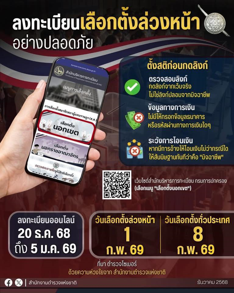 ลงทะเบียนเลือกตั้งล่วงหน้าอย่างปลอดภัยอย่าหลงกลมิจฉาชีพ “ฉกข้อมูล – หลอกโอนเงิน”ตรวจสอบแหล่งที