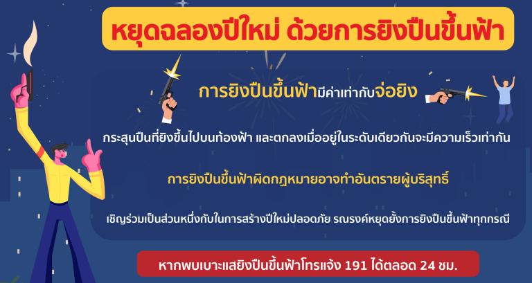 ห่วงใยประชาชน ปีใหม่…..ไม่ลั่นไก 26 ธันวาคม 2566 โดย admnongbunmak / ข่าวประชาสัมพันธ์,ข่าวฝากประชาสัมพันธ์ ยิงปืนขึ้นฟ้า ผิดกฎหมาย พกพาอาวุธปืนติดตัวไปในเมือง หมู่บ้าน หรือทางสาธารณะโดยไม่ได้รับอนุญาต ฝ่าฝืน มีโทษจำคุกไม่เกิน 5 ปี หรือปรับไม่เกิน 10,000 บาท หรือทั้งจำทั้งปรับ หากกระสุนตกใส่หรือทะลุหลังคาบ้านเรือน ทำให้ทรัพย์สินเสียหาย หรือมีผู้ได้รับบาดเจ็บ หรือเสียชีวิต มีความผิดตามประมวลกฎหมายอาญา โทษสูงสุดจำคุก 10 ปีและปรับไม่เกิน 200,000 บาท