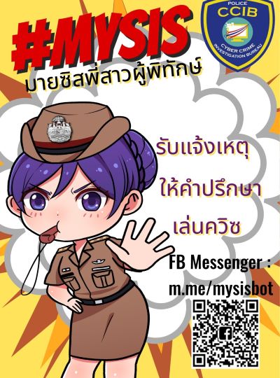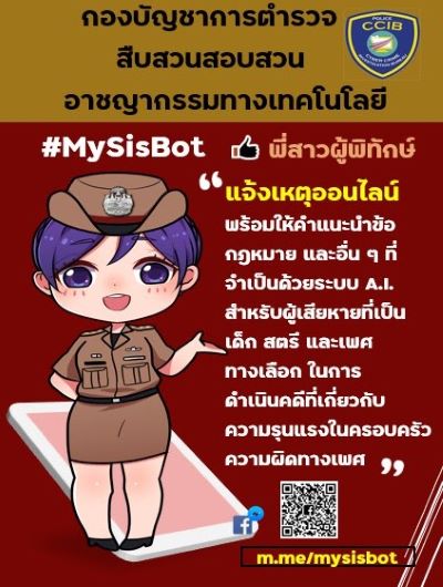 ตำรวจไซเบอร์เปิดรับแจ้งเหตุออนไลน์ โดยให้คำแนะนำและคำปรึกษาข้อกฎหมาย ผ่าน FB Messenger MySIS Chatbot หรือ มายซิสพี่สาวผู้พิทักษ์ ซึ่งเป็นระบบ AI ที่มีขีดความสามารถในการตอบคำถามที่พบบ่อยและเป็นเพื่อนพูดคุยอยู่เคียงข้างเด็กและสตรีในการต่อสู้กับความรุนแรงและการล่วงละเมิดทางเพศได้ที่ m.me/mysisbot
