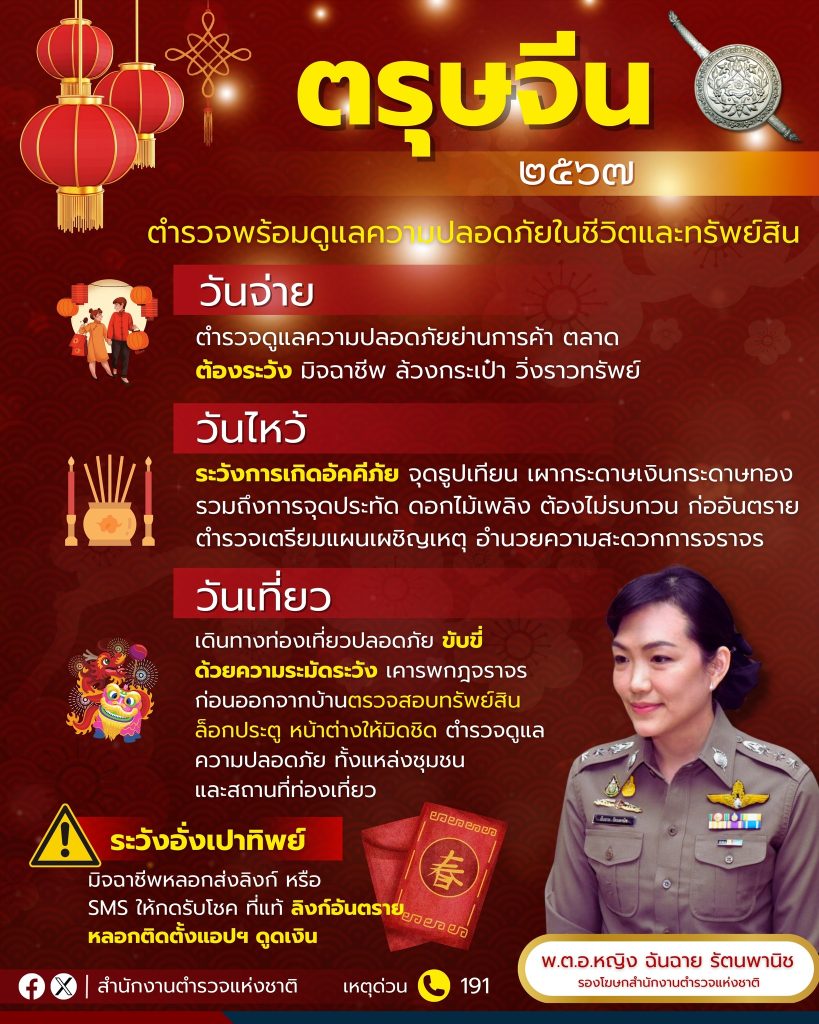 ผบ.ตร. สั่งการ 4 มาตรการ ให้ตำรวจดูแลประชาชน เพิ่มความเข้มงวด ด้านความปลอดภัยในชีวิตและทรัพย์สิน อำนวยความสะดวกด้านการจราจร ป้องกันมิจฉาชีพฉวยโอกาสในเทศกาล “ตรุษจีน 2567” เน้น วันจ่าย วันไหว้ วันเที่ยว เตือนภัยออนไลน์หลอกกดลิงก์แจกอั่งเปา มอบโชค ย้ำระมัดระวังอัคคีภัย – จุดประทัด